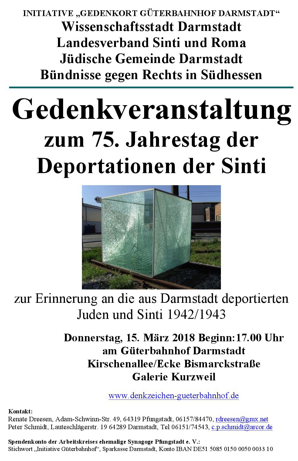 Der Verband Deutscher Sinti und Roma Landesverband Hessen e.V. lädt am Donnerstag, den 15. März 2018 um 17 Uhr ein  zur Gedenkveranstaltung zum 75. Jahrestag der Deportation der Darmstädter Sinti – in Erinnerung an die Deportation der Darmstädter Juden und Sinti 1942/43.